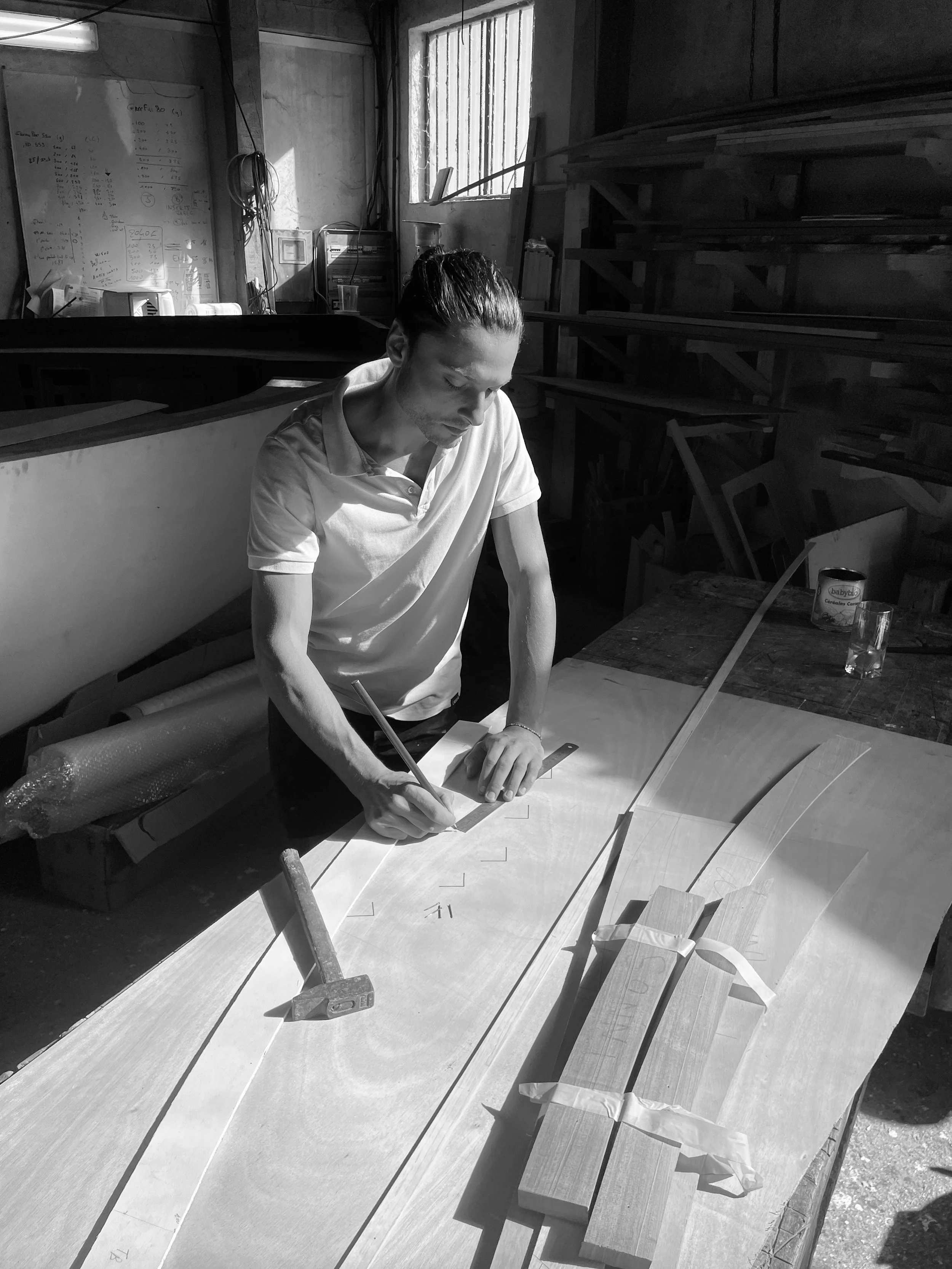 Pour la construction de l’Olivier, nous avons fait le choix du strip planking, ou « bordé latté » : la coque en bois-époxy est réalisée par juxtaposition de fines lattes de bois sur un mannequin, puis stratifiée sur les deux faces. Une méthode aux performances mécaniques de haut niveau, garantissant légèreté et durabilité, pour peu d’entretien requis.